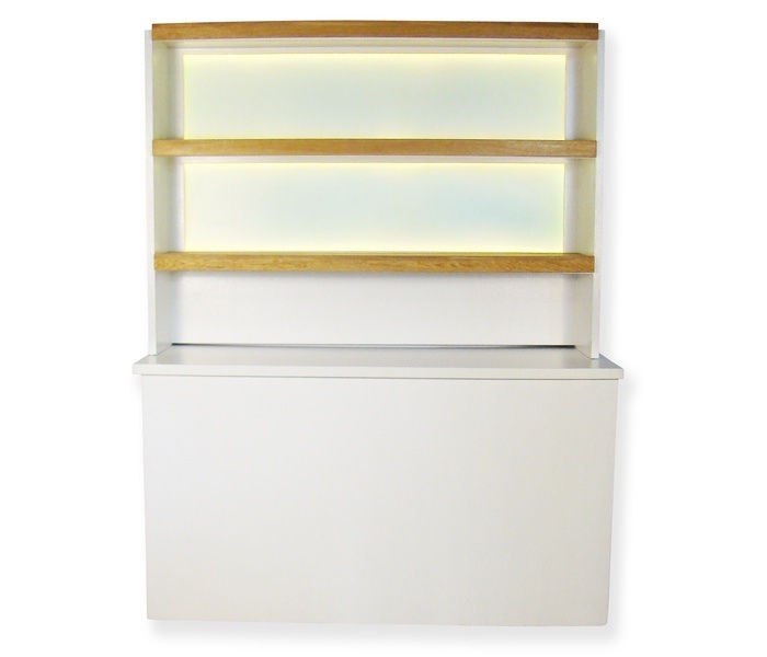 Witte achterwand met ingebouwde LED-verlichting en eikenhouten accenten. De kleur wordt automatisch gevarieerd of kan worden geregeld met de bijgeleverde afstandsbediening.