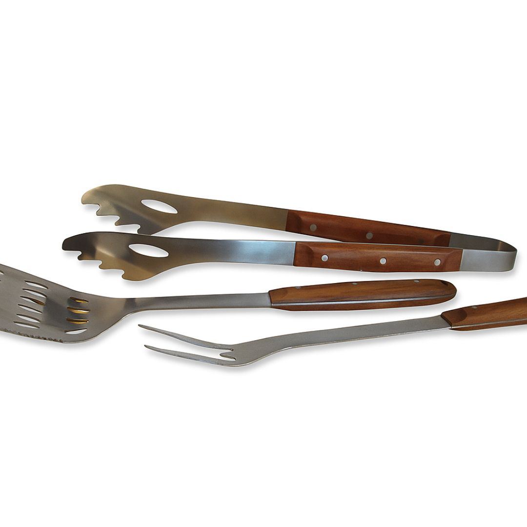 Deze barbecue tangenset bestaat uit: een tang, een spatel en een vork.