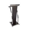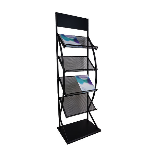 Mooi zwart folderrek met een gebogen ontwerp. Het folderrek heeft 4 folderhouder etages, elk in een licht gekantelde houding. Het rek staat stabiel op een stevige voet. Het staande folderrek is geschikt voor het plaatsen van de formaten A3, A4 en A4 documenten, als: folders, flyers en menu’s.
