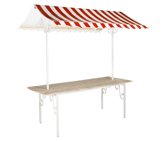 Deze Franse partykraam met rood/wit gestreept doek is in te zetten op verschillende evenementen. Hij is in drie kleuren beschikbaar.