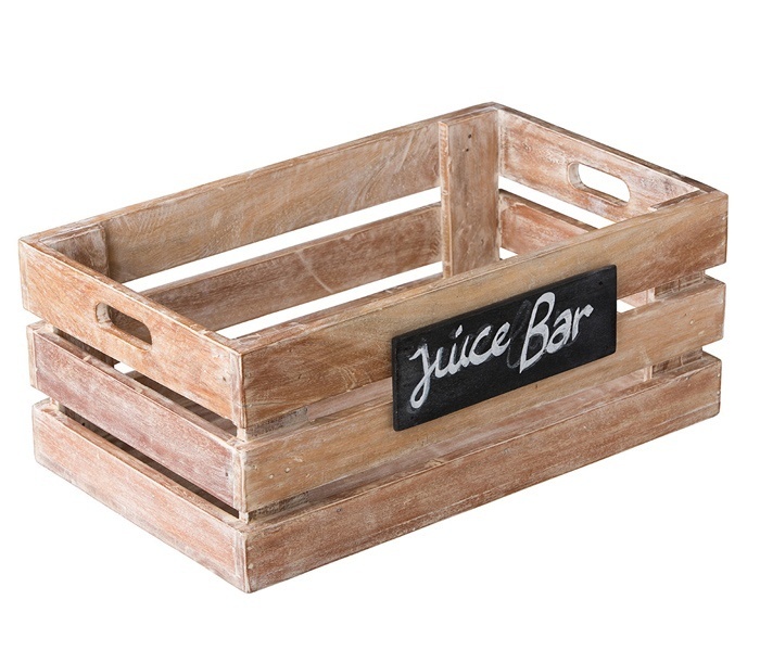 Deze krat van gerecycled mangohout heeft een beschrijfbaar krijtbord en kan bijvoorbeeld gebruikt worden om fruit of sapflessen in te presenteren.