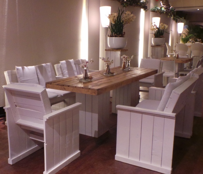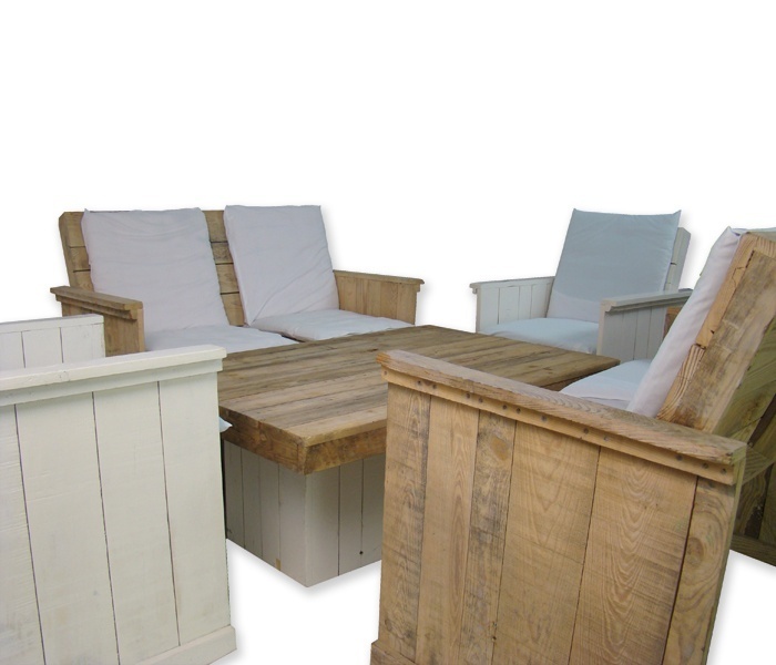 Deze steigerhouten deluxe set bestaat uit 2 fauteuils, 2 banken met rugleuning, salontafel en 10 witte kussens. De kussens zijn verkrijgbaar in verschillende kleuren, zodat de inrichting naar jouw smaak gemaakt kan worden. Om gewicht te besparen is dit product gemaakt van sloophout.