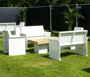 Deze steigerhouten deluxe set bestaat uit 2 fauteuils, 2 banken met rugleuning, salontafel en 10 witte kussens. De kussens zijn verkrijgbaar in verschillende kleuren, zodat de inrichting naar jouw smaak gemaakt kan worden. Om gewicht te besparen is dit product gemaakt van sloophout.