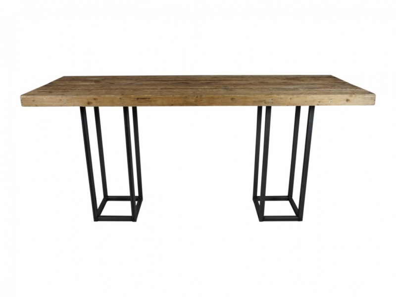 Steigerhout is een van de grotere meubilairtrends van de laatste jaren. Deze statafel bestaat uit een houten blad en een metalen frame. De tafel is gemaakt van sloophout, om gewicht te besparen. Hij kan zowel binnen als buiten staan. Het blad is demontabel.