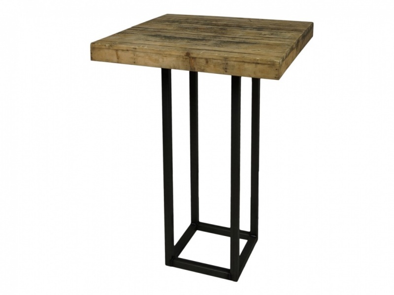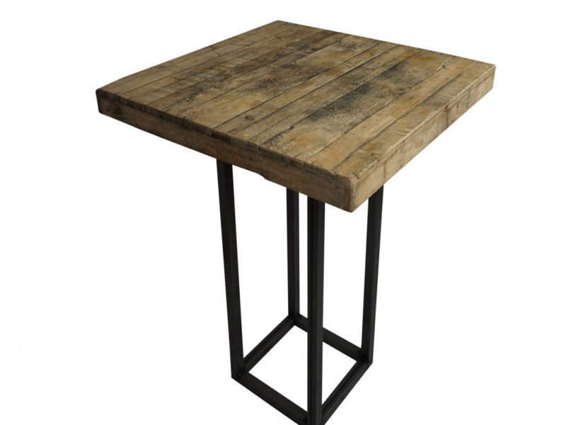 Steigerhout is een van de grotere meubilairtrends van de laatste jaren. Deze statafel bestaat uit een houten blad en een metalen frame. De tafel is gemaakt van sloophout, om gewicht te besparen. Hij kan zowel binnen als buiten staan. Het blad is demontabel.