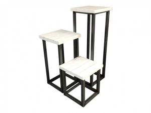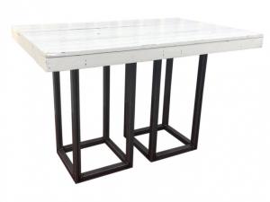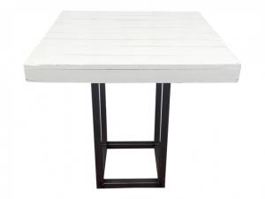 Steigerhout is een van de grotere meubilairtrends van de laatste jaren. Deze statafel bestaat uit een houten blad en een metalen frame. De tafel is gemaakt van sloophout, om gewicht te besparen. Hij kan zowel binnen als buiten staan. Het blad is demontabel.