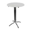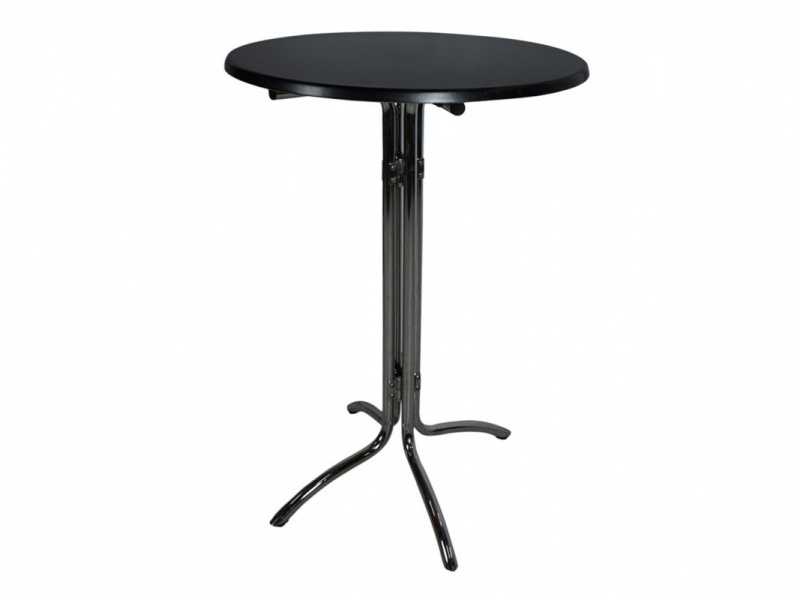 Deze ronde statafel heeft een zwart tafelblad en een chromen onderstel. De statafel is demontabel en de voet kan worden ingeklapt. Het onderstel is voorzien van stelschroeven zodat de statafel op een ongelijke ondergrond altijd stabiel staat.