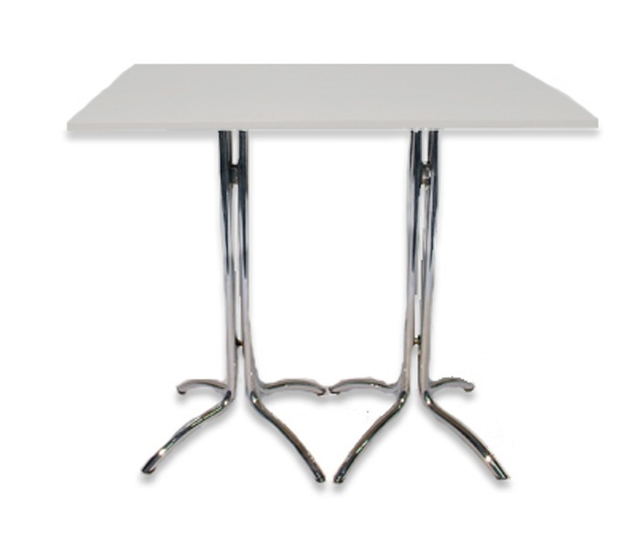 Deze witte statafel heeft twee chrome poten. De tafel is demontabel en de poten zijn inklapbaar. Om wiebelen op een ongelijke ondergrond te voorkomen zijn de poten voorzien van stelschroeven.