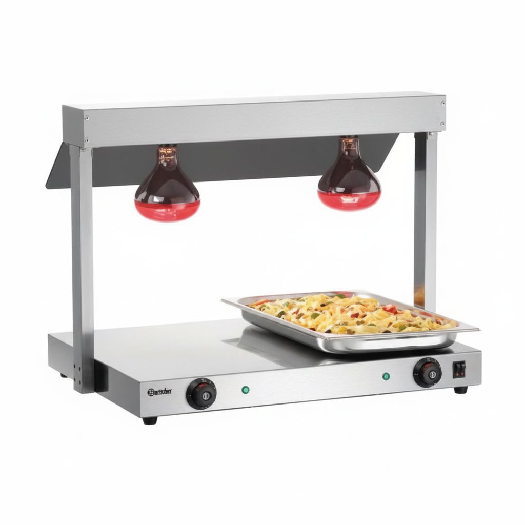 Deze professionele warmtebrug is ideaal om gerechten warm te houden tijdens buffetten, feesten en cateringopstellingen. Dankzij de krachtige infraroodwarmte en de verwarmde plaat blijven maaltijden gelijkmatig op temperatuur. Geschikt voor twee 1/1 GN-bakken en eenvoudig te plaatsen op elke buffettafel.