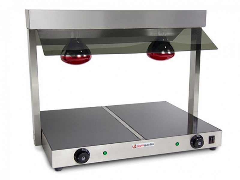 Warmhoudplaat met warmhoudbrug, van roestvrijstaal en met verchroomde staanders. Beschikt over apart inschakelbare verwarmde warmhoudplaat, instelbaar van 30C tot 85C. Compleet met hygiënische beschermkap en infra-roodlampen.